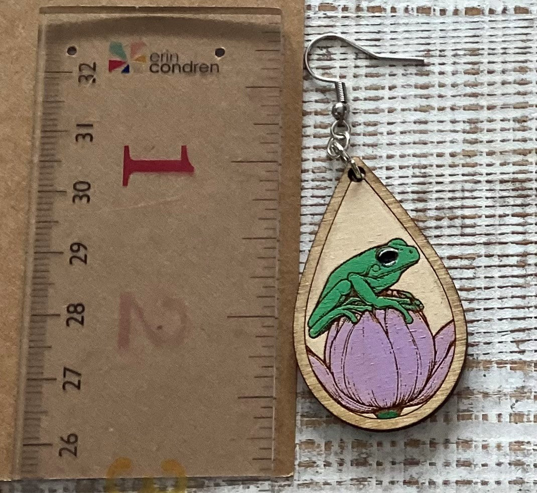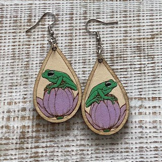 Lightweight wood dangle earrings that measure approximately 2 1/2" long.  Ear wires are hypoallergenic.